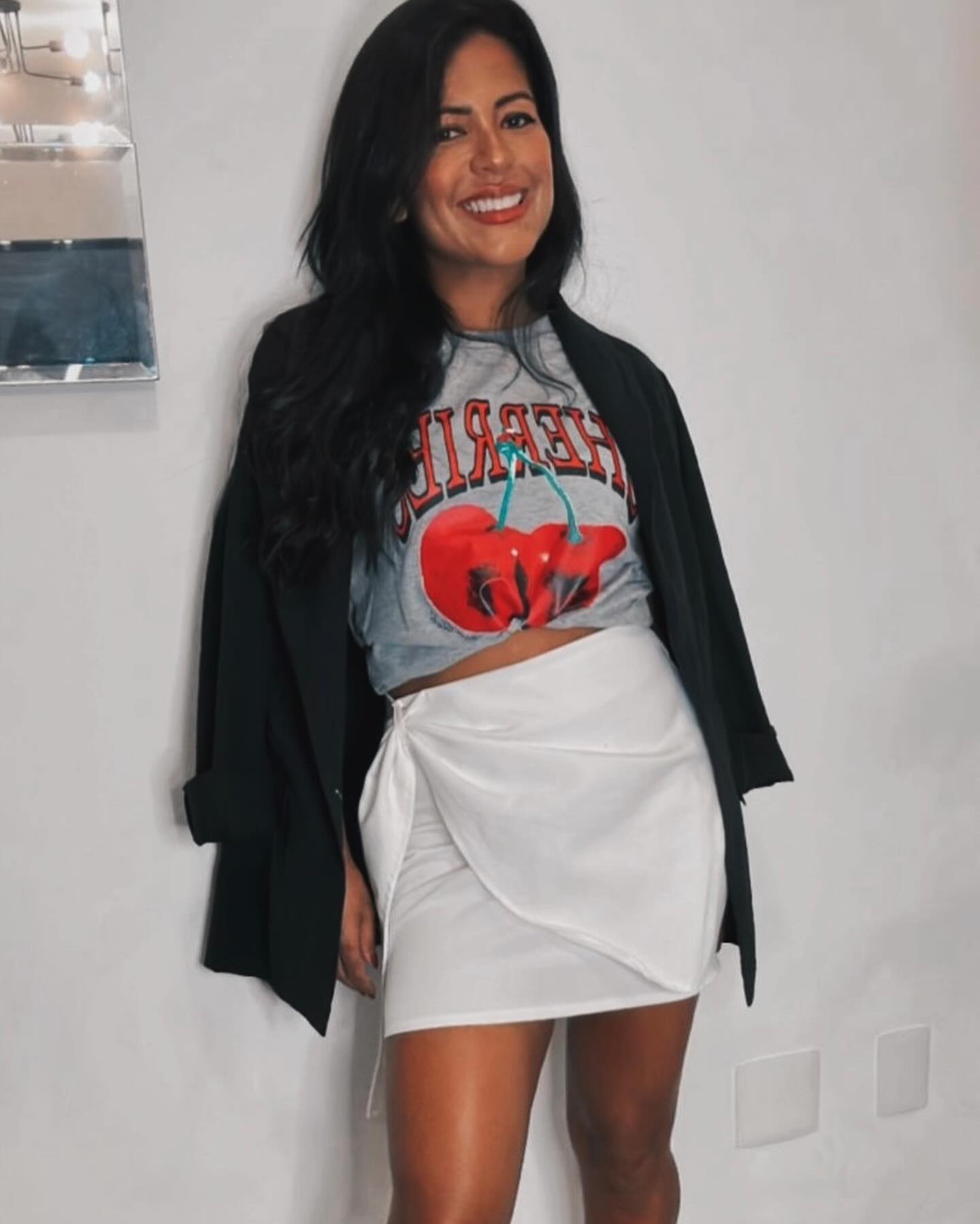 Camiseta com estampa de cereja na cor cinza.