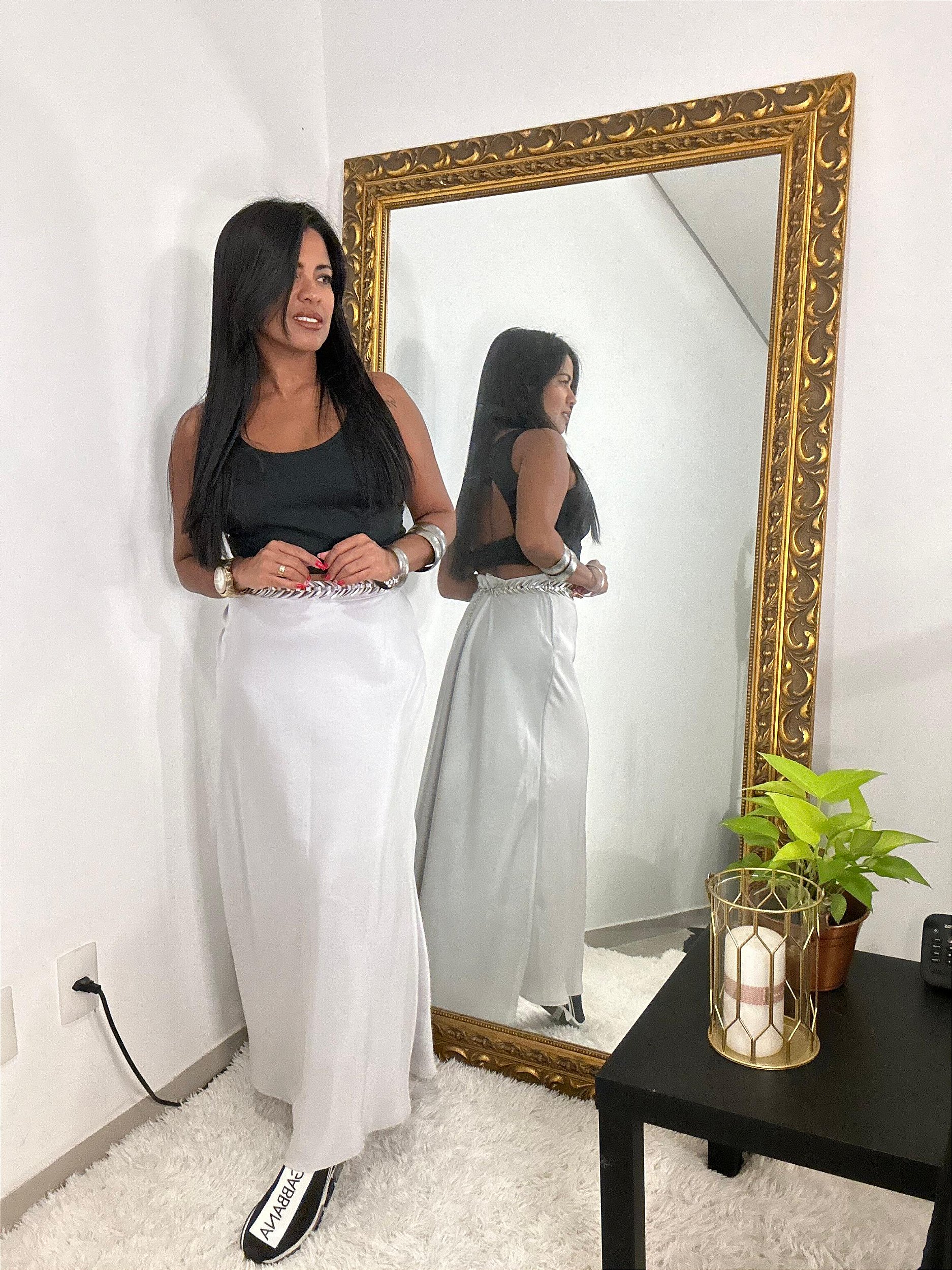 Saia de cetim preta.Tamanho único: veste 38/40. A saia de cetim que vai do trabalho à praia, perfeita para looks descolados e formais. Versatilidade e estilo em uma única peça!